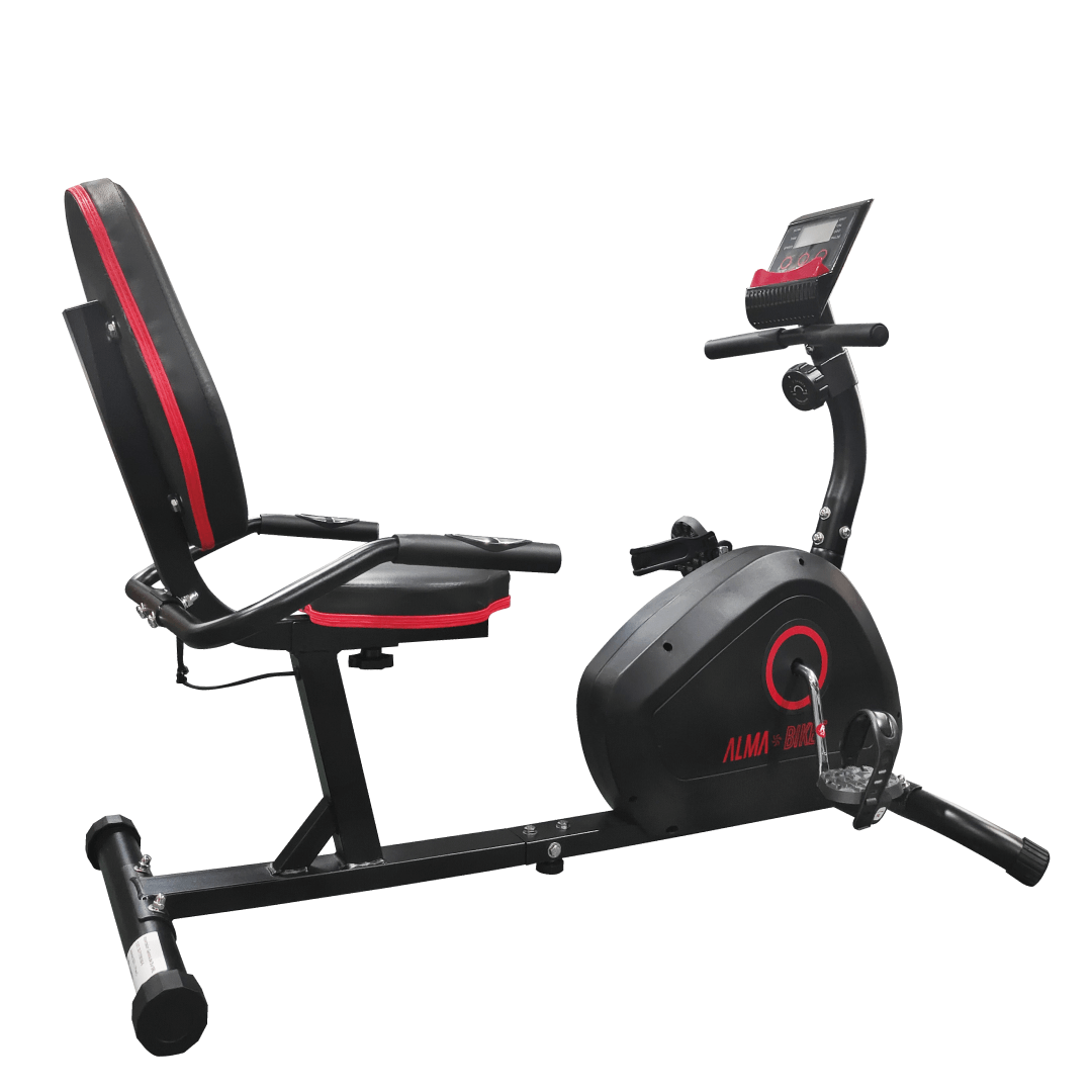 ¡Hoy es el día para transformar tu vida, entrenando desde casa con la BICICLETA ESTÁTICA HORIZONTAL ALMA BIKES CONFORT AB2103 Pulso + Display Color Negro combinado con Rojo.