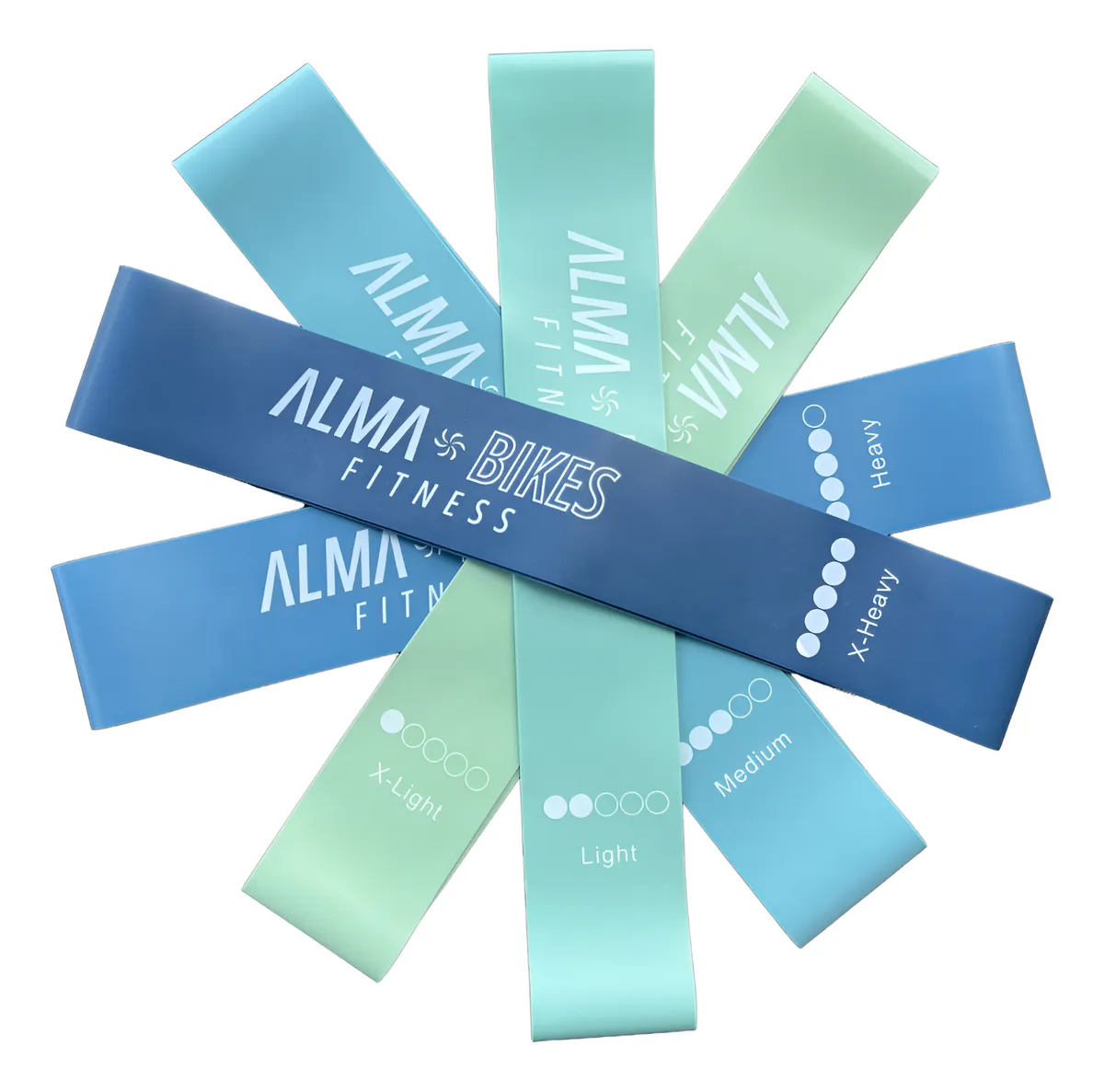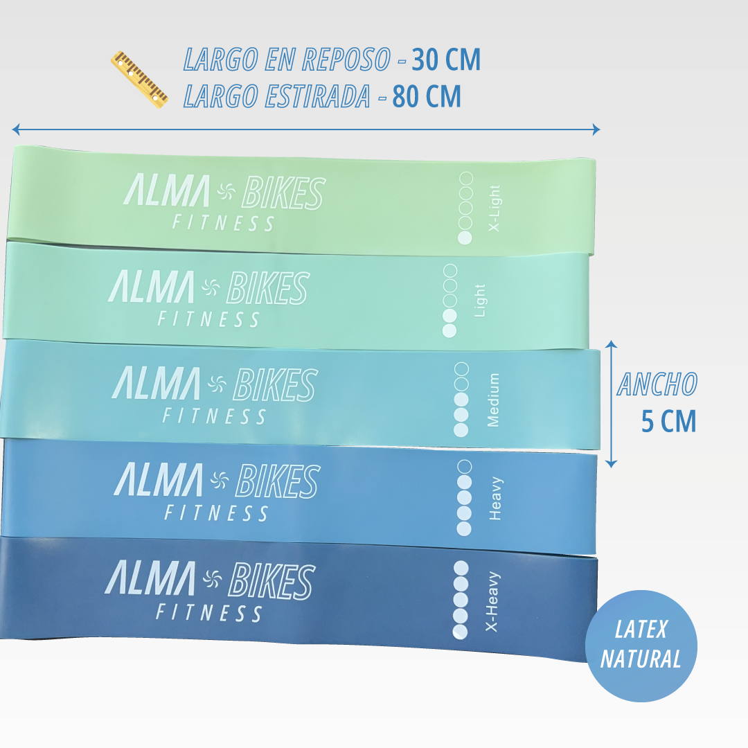 Set 5 Bandas De Resistencia Circulares Alma Bikes Fitness Elite 100% látex natural. Kit de Entrenamiento Completo + bolso + ¡BONO EXCLUSIVO! te llevás 1 mes de plan de entrenamiento personalizado 100% gratis por entrenador en alto rendimiento.
