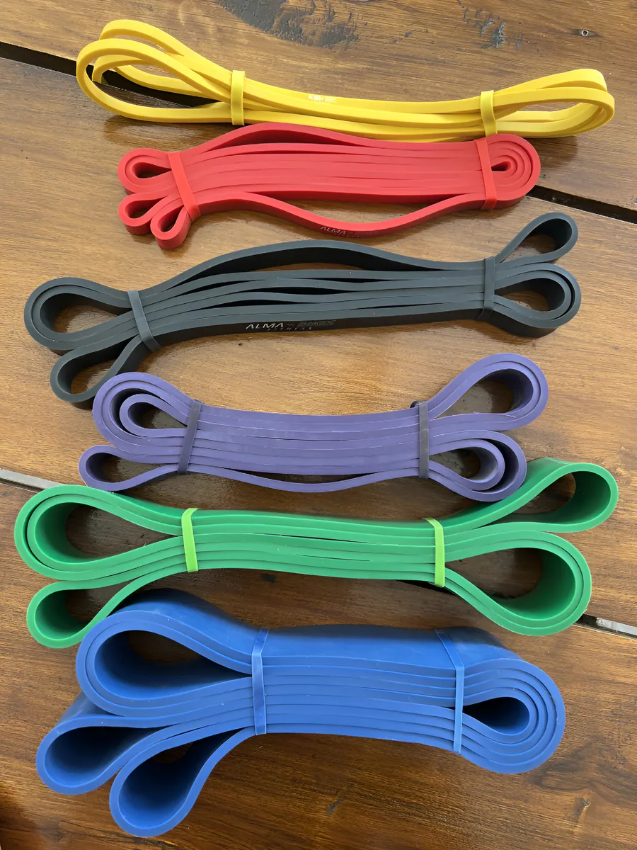 Entrená todo tu cuerpo con el set completo de 6 bandas de resistencia ALMA BIKES Fitness Élite, fabricadas en látex natural 100% de alta calidad.